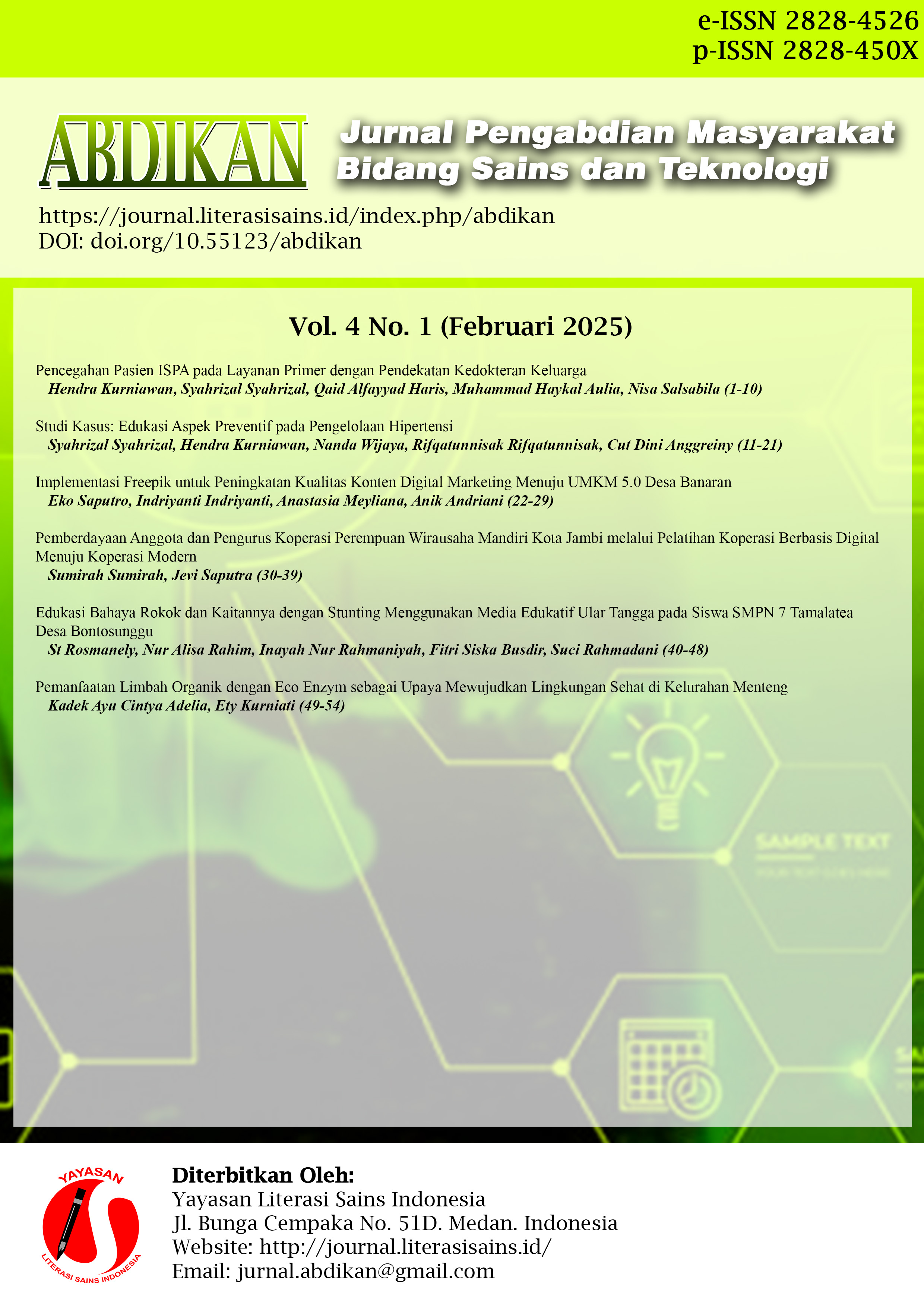 Vol. 3 No. 2 (2024)Pada terbitan edisi Volume 3 Nomor 2 (Mei 2024) penulis terdiri dari berbagai Perguruan tinggi di Indonesia diantaranya: Universitas dr. Soebandi, Universitas Sriwijaya, Universitas Jember, Institut Teknologi Indonesia, Universitas Syiah Kuala, Universitas Pattimura, Universitas Musamus, Universitas Sarjanawiyata Tamansiswa, Politeknik Negeri Lampung, STK St. Yakobus, Poltekkes Kemenkes Maluku, Universitas Sumatera Utara, Universitas Pelita Harapan, Universitas Madura dan Universitas Mikroskil.