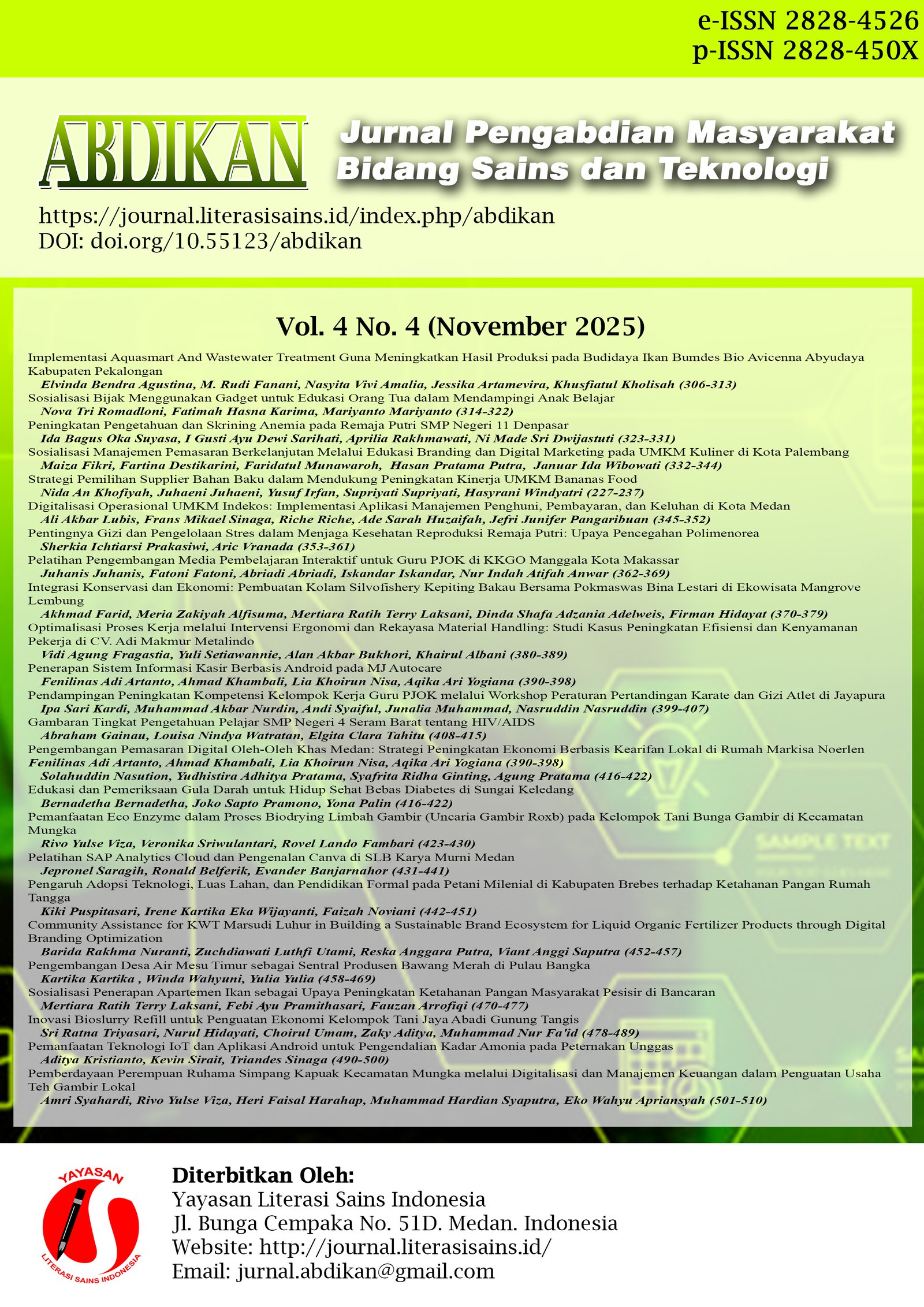 Vol. 4 No. 4 (2025)Pada terbitan edisi Volume 4 Nomor 4 (November 2025) penulis terdiri dari berbagai Perguruan tinggi di Indonesia diantaranya: Universitas Janabadra Yogyakarta, Universitas Sriwijaya, Politeknik Negeri Lampung, Universitas Semarang, Universitas Pelita Bangsa, Politeknik Pertanian Negeri Payakumbuh, UIN Sayyid Ali Rahmatullah Tulungagung, Universitas Cenderawasih, Sekolah Tinggi Keguruan dan Ilmu Pendidikan Biak, Institut Teknologi Bisnis Ahmad Dahlan Jakarta, Institut Pertanian INTAN Yogyakarta, Universitas Gadjah Mada Yogyakarta, Universitas Udayana Bali, Universitas Sebelas Maret, Universitas Muhammadiyah Karanganyar, Universitas Jenderal Soedirman, Universitas Katolik Santo Thomas, Universitas Muhammadiyah Prof. DR. HAMKA, Politeknik Perkapalan Negeri Surabaya, Universitas Pembangunan Nasional "Veteran" Jawa Timur, Institut Teknologi Sepuluh Nopember, dan Universitas Mikroskil.