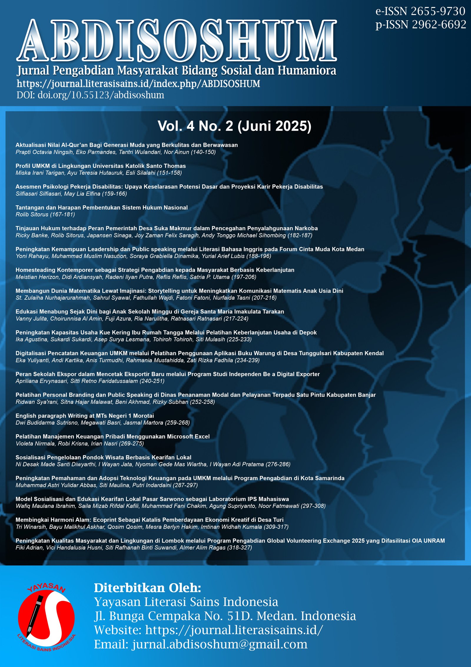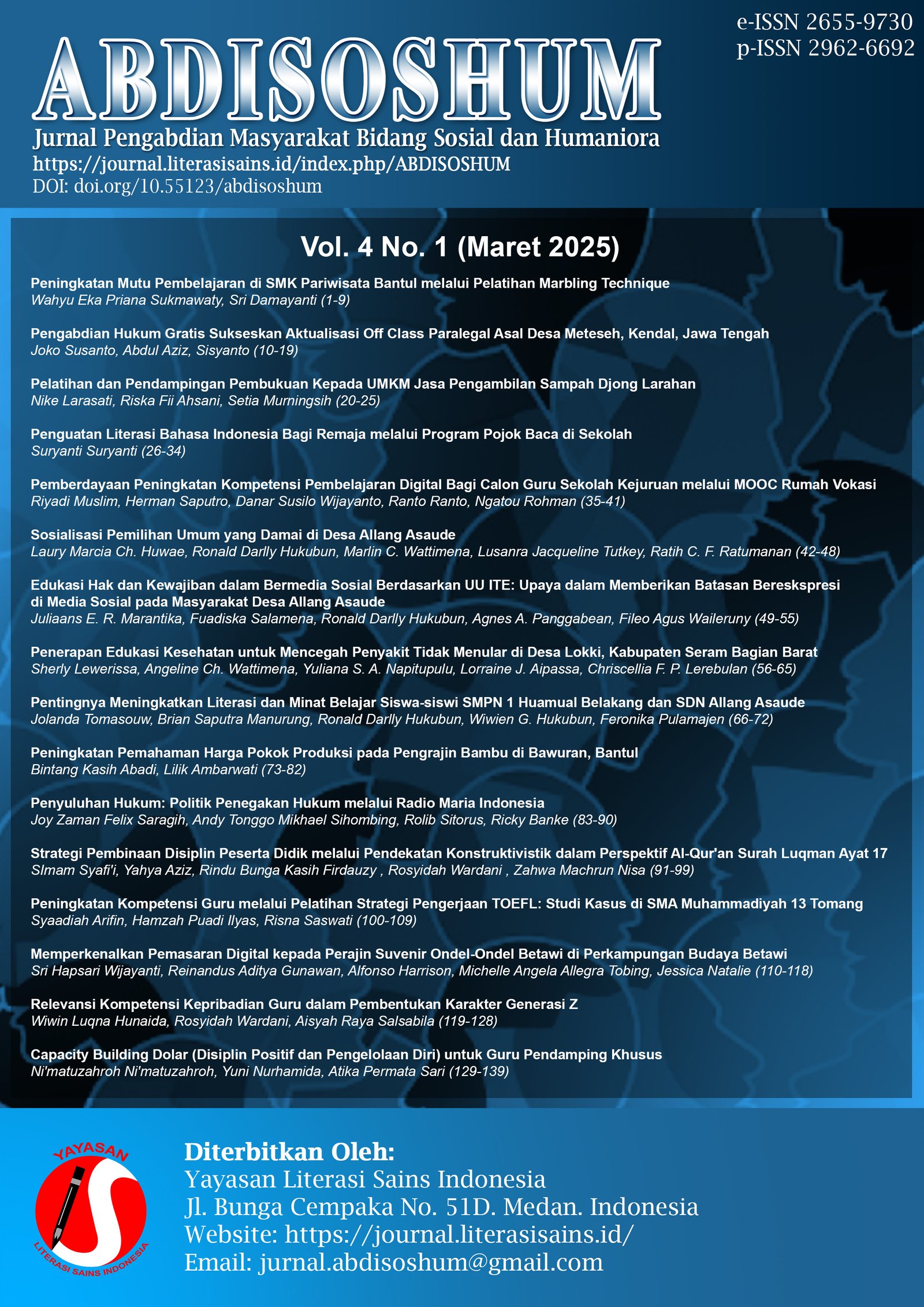 Vol. 4 No. 1 (2025)Pada terbitan edisi Volume 4 Nomor 1 (Maret 2025) penulis terdiri dari berbagai Perguruan tinggi di Indonesia dan dari Instansi Pemerintah, diantaranya: Akademi Kesejahteraan Sosial AKK, Kelompok Keluarga Sadar Hukum, Lembaga Bantuan Hukum Wongsonegoro, Pemerintah Desa Meteseh, Universitas Slamet Riyadi, Universitas Muhammadiyah Buton, Universitas Sebelas Maret, Universitas Pattimura, Sekolah Tinggi Ilmu Ekonomi Widya Wiwaha, Universitas Pelita Harapan, UIN Sunan Ampel Surabaya, Universitas Muhammadiyah Prof. Dr. hamka, Universitas LIA, Universitas Katolik Indonesia Atma Jaya dan Universitas Muhammadiyah Malang.