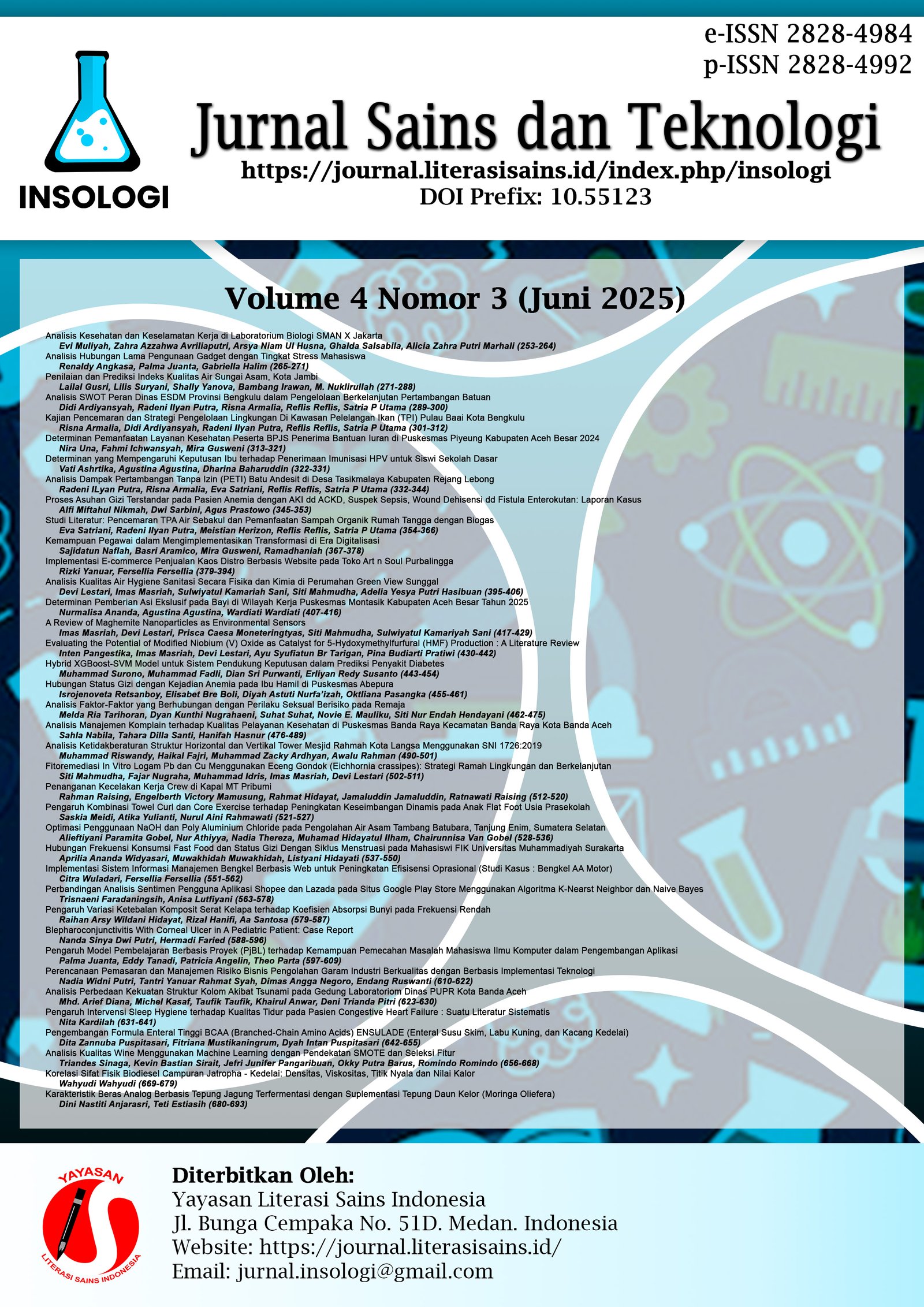 Vol. 4 No. 3 (2025)Pada terbitan edisi Volume 4 Nomor 3 (Juni 2025) penulis terdiri dari berbagai Perguruan tinggi di Indonesia dan dari Instansi Pemerintah, diantaranya: UIN Syarif Hidayatullah Jakarta, Universitas Prima Indonesia, Universitas Jambi, Universitas Bengkulu, Universitas Muhammadiyah Aceh, Universitas Muhammadiyah Surakarta, Rumah Sakit Umum Daerah Purwokerto, Universitas Ma'arif Nahdlatul Ulama Kebumen, Politeknik Negeri Medan, Universitas Teknokrat Indonesia, Politeknik Negeri Lampung, Universitas Cenderawasih, Universitas Jenderal Achmad Yani, Universitas Samudra, Universitas Islam Indonesia, Universitas Gadjah Mada, Politeknik Maritim AMI Makassar, Politeknik Pelayaran Sorong, Politeknik Ilmu Pelayaran Makassar, Universitas Muhammadiyah Malang, Universitas Sriwijaya, PT. Mitra Jaya Rejeki, PT. Agrinas Jaladri Nusantara (Persero), Universitas Muhammadiyah Surakarta, Universitas Ma’arif Nadhlatul Ulama, Universitas Singaperbangsa Karawang, Universitas Muhammadiyah Surabaya, Universitas Esa Unggul, Universitas Gunung Leuser Aceh, Sekolah Tinggi Ilmu Kesehatan Karsa Husada, Universitas Pelita Harapan, Universitas Muhammadiyah Yogyakarta, Politeknik Negeri Banyuwangi dan Universitas Brawijaya.