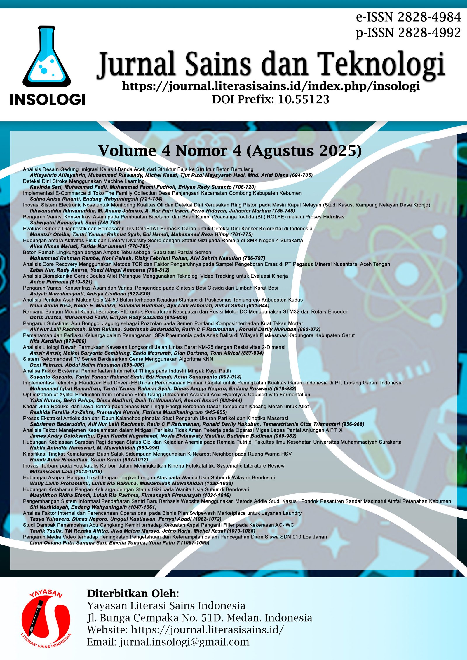 Vol. 4 No. 4 (2025)Pada terbitan edisi Volume 4 Nomor 4 (Agustus 2025) penulis terdiri dari berbagai Perguruan tinggi di Indonesia dan dari Instansi Pemerintah, diantaranya: Universitas Samudra, Universitas Teknokrat Indonesia, Politeknik Negeri Lampung, Universitas Ma'arif Nahdlatul Ulama, Sekolah Tinggi Ilmu Pelayaran Jakarta, Universitas HKBP Nommensen, Politeknik Negeri Medan, Universitas Esa Unggul, Universitas Muhammadiyah Surakarta, Universitas Graha Nusantara, Universitas Negeri Medan, Universitas Negeri Padang, Universitas Gunung Leuser, Politeknik STTT Bandung, Badan Riset dan Inovasi Nasional (BRIN), Universitas Jenderal Achmad Yani, Universitas Pattimura, PT. Vale Indonesia, Sorowako, Universitas Padjajaran, Universitas Syiah Kuala, Universitas Islam Negeri Sumatera Utara, Universitas Jember, Universitas Pattimura, Universitas Nias Raya, Universitas Ma'arif Nahdlatul Ulama Kebumen dan Poltekkes Kemenkes Kalimantan Timur.