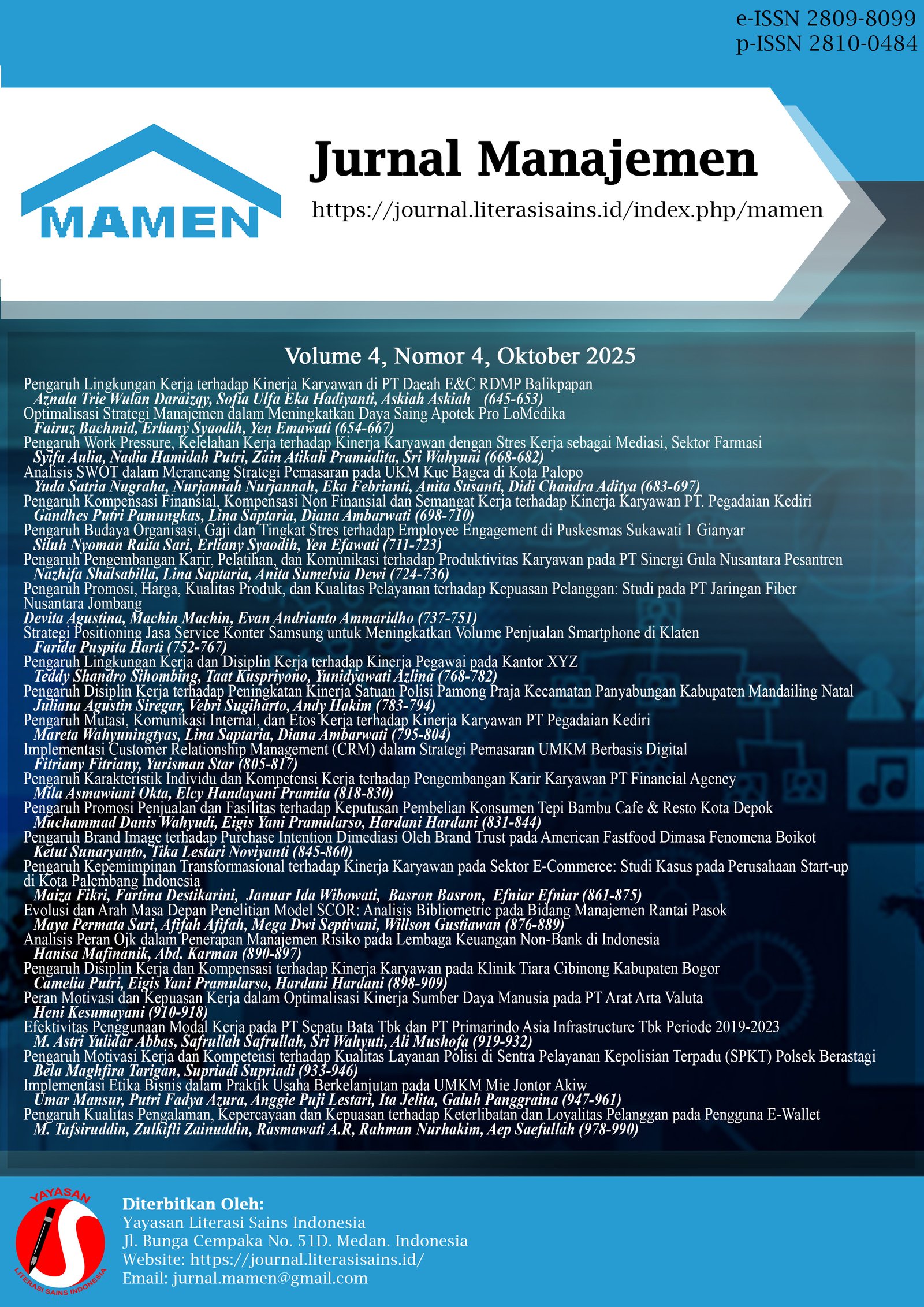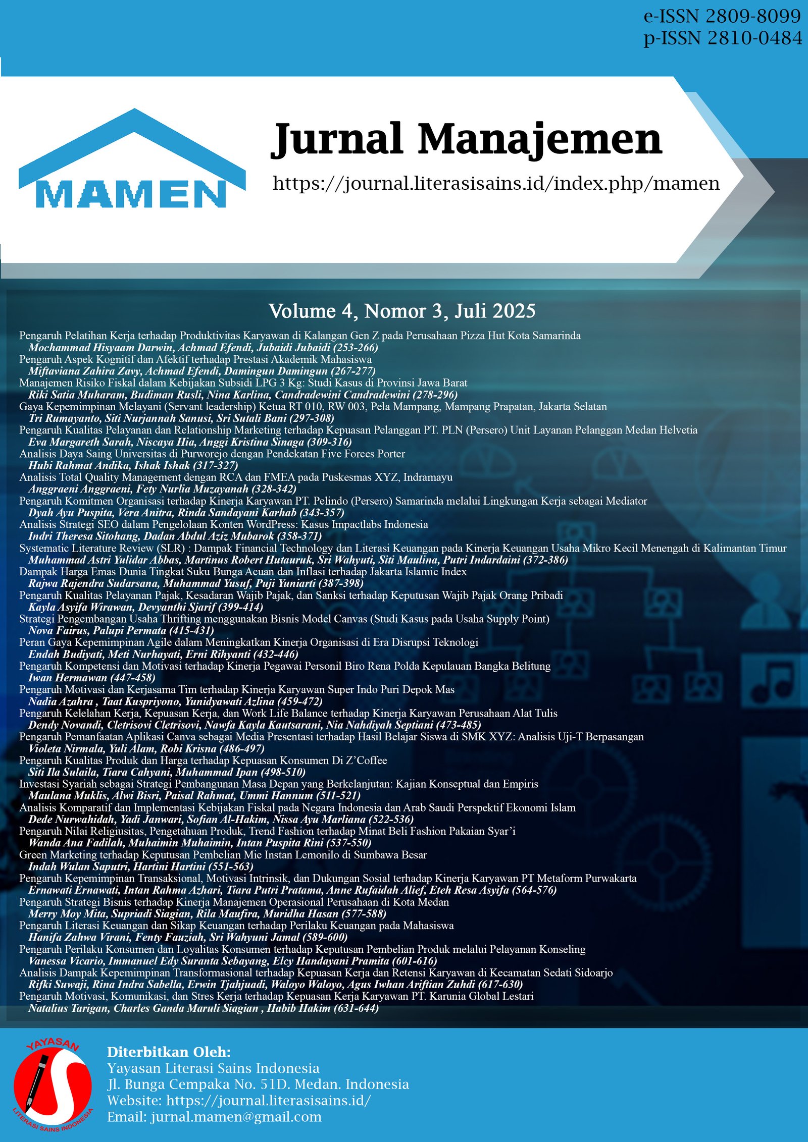 Vol. 4 No. 2 (2025)Pada terbitan edisi Volume 4 Nomor 2 terdiri dari 28 penulis dari berbagai Perguruan Tinggi di Indonesia, diantaranya: Universitas Islam Negeri Raden Intan Lampung, Universitas Darussalam Gontor, Akademi Entrepreneurship Terang Bangsa, Universitaas Islam Negeri Raden Intan Lampung, Universitas Islam Negeri Sunan Kalijaga Yogyakarta, Universitas Pelita Harapan, Politeknik Sekayu, Universitas Asa Indonesia, Universitas Adhirajasa Reswara Sanjaya, Universitas Putera batam, STIE Port Numbay Jayapura dan Universitas Pasifik Morotai.